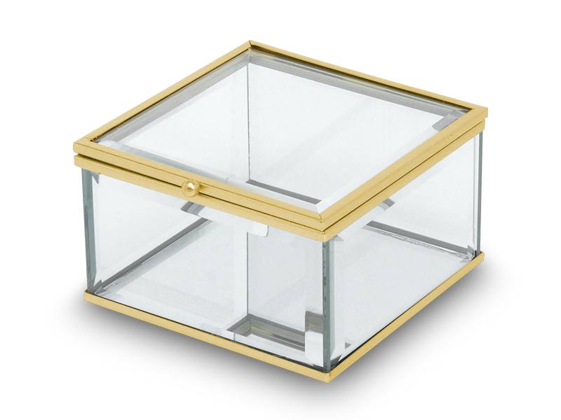 Uniwersalna szkatułka z zamykanym wiekiem o szklanej konstrukcji i lustrzanym spodzie.