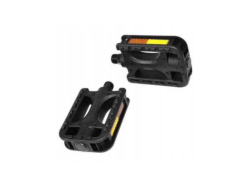 Komplet 2 standardowych pedałów rowerowych. Wyposażone w standardowy gwint montażowy 14 mm (9/16``). Solidne łożyska kulkowe zapewniają długie użytkowanie. Każdy z pedałów wyposażony został w obustronne odblaski.