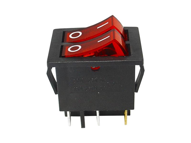 Wysokiej jakości przełącznik podwójny pracujący w napięciu do 250 V. Przełącznik dwu pozycyjny ON-OFF. Element wykonawczy w kolorze czerwonym.