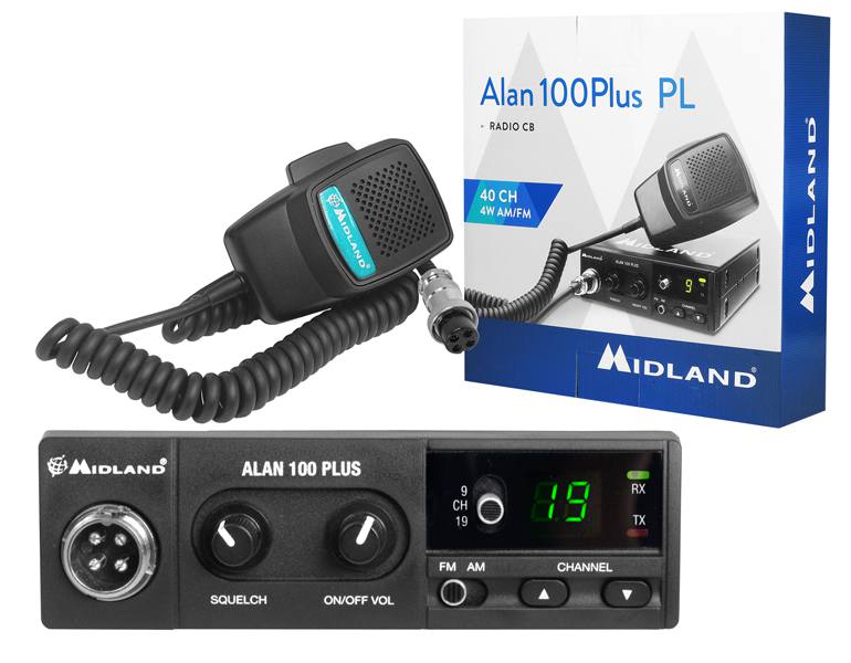 Radio Alan 100 plus. Doskonale nadaje się to montażu w każdym samochodzie. Dzięki prostej obsłudze oraz wysokiej ergonomii jest szczególnie cenione przez kierowców. Możliwość szybkiego przełączania na kanał 9 lub 19, zmiana pozostałych kanałów przyciskami góra/dół. Cyfrowy wyświetlacz numeru kanału. Blokada szumów. Pobór prądu 1100 mA (bez modulacji).