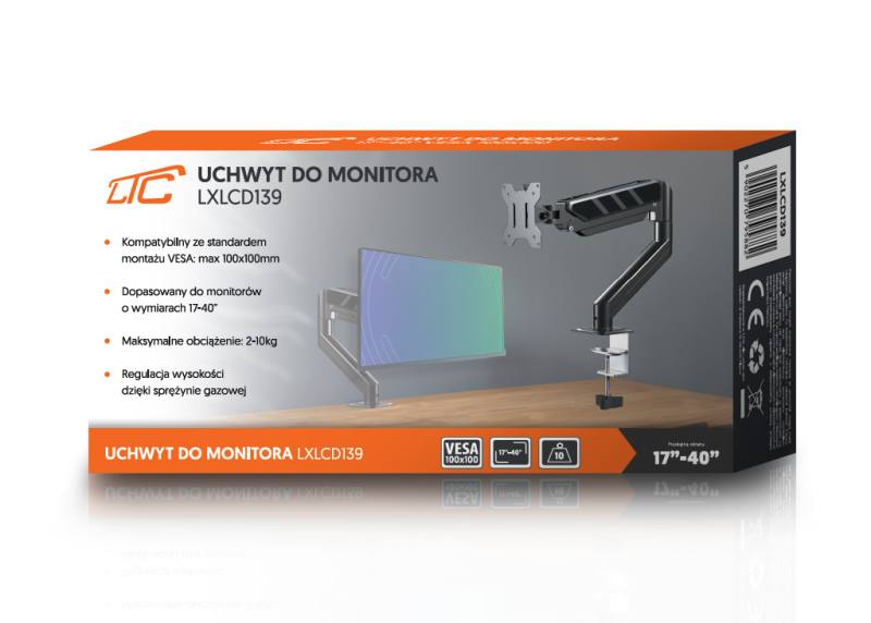 Do uchwytuLTC LCD139 możesz podłączyć monitor w rozmiarze od 17 cali do 40 cali. Maksymalna waga monitora, jaką możesz zawiesić na uchwycie wynosi 10 kilogramów. Zyskujesz również możliwość odchylenia monitora pod kątem -70°/+45° w płaszczyźnie góra/dół oraz -90°/+90° w płaszczyźnie lewo/prawo.W zestawie znajdziesz elementy potrzebne do zamontowania uchwytu zarówno do krawędzi biurka, jak i przy pomocy otworu w blacie. Uchwyt oferuje wsparcie dla standardów VESA 100 x 100 mm. Przewodami monitora będziesz mógł zarządzać dzięki specjalnym uchwytom.