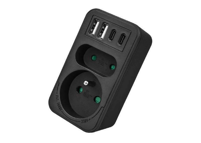 Rozgałęźnik sieciowy: 1 gniazdo okrągłe z uz.+ 1 gniazdo płaskie + 2x USB + 2x USB-C 3,1A czarny