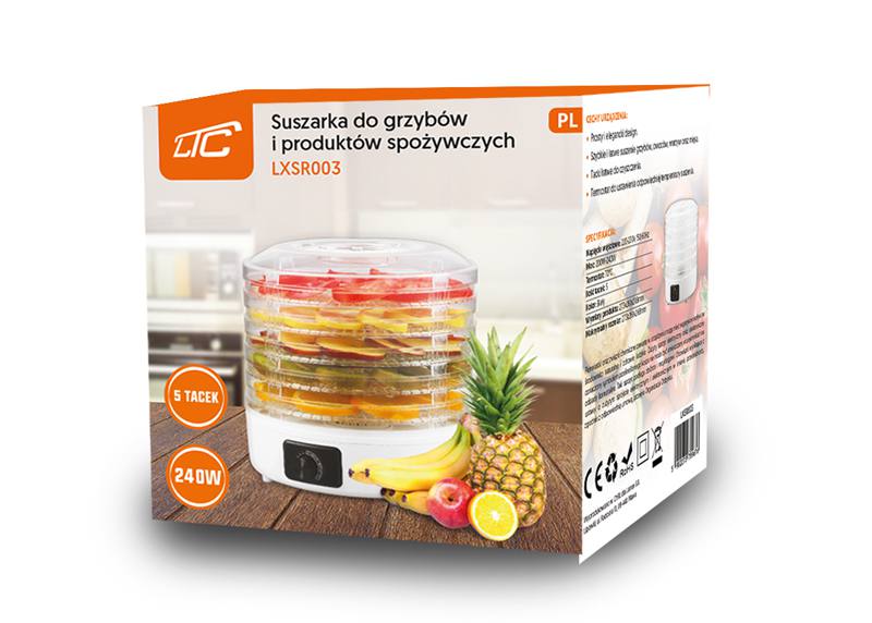SUSZARKA DO GRZYBÓW, OWOCÓW, WARZYW ORAZ ZIÓŁ RENOMOWANEJ MARKI "LTC"Uniwersalna suszarka do suszenia grzybów, owoców, warzyw i ziół. Urządzenie przydatne w każdej nowoczesnej kuchni. Dzięki niej zachowasz smak i aromat swoich ulubionych owoców, warzyw, grzybów czy ziół na dłużej, tak, aby można było cieszyć się nimi niezależnie od pory roku, nawet w zimę. Zastosowanie innowacyjnej technologii, gwarantuje idealne parametry dla procesu suszenia - stabilny przepływ powietrza z idealnie dostosowaną temperaturą.