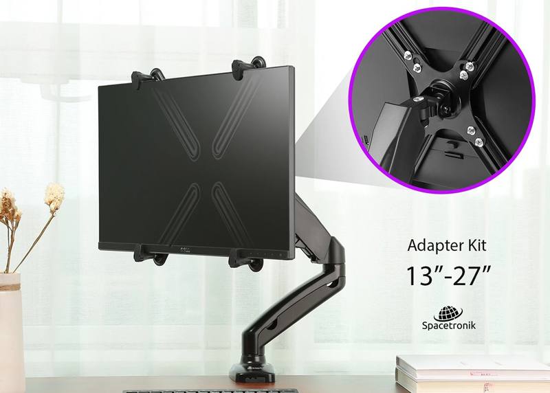 Ten adapter obsługuje większość monitorów 13"-27" o grubości od 26,5 mm do 65 mm. Umożliwia zamontowanie monitora innego niż VESA na prawie każdym ergonomicznym ramieniu monitora i regulację w celu zwiększenia komfortu oglądania.