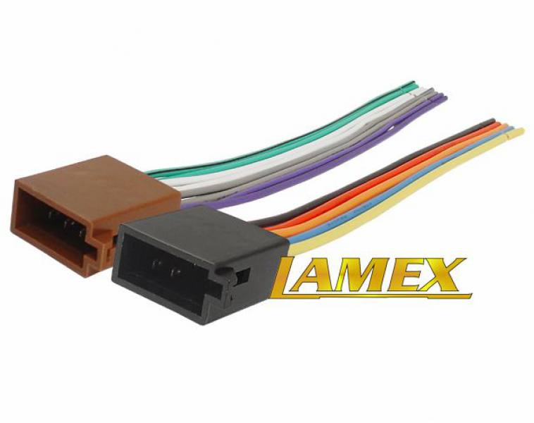Standardowe gniazda głośnikowe i zasilania ISO, solidnie wykonane, z oznaczeniami na przewodach.