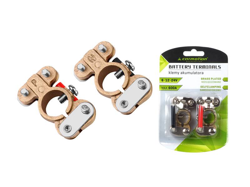 Klemy mosiężne, samozaciskowe o przepustowości do 600 A, przeznaczone do wszystkich typów akumulatorów 6/12/24 V. Można je szybko podłączyć/odłączyć bez użycia jakichkolwiek narzędzi.