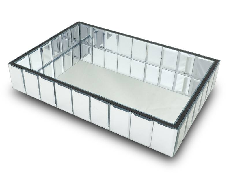 Taca Squre została wykonana w całości ze szkła. Duża lustrzana tafla szkła stanowi podstawę tacy. Ozdobne obramowanie wykonane z małych lusterek wystaje o 4,5 cm ponad powierzchnie tacy, chroniąc wysokie przedmioty przed upadkiem i zapewniając większą stabilność zawartości tacy.