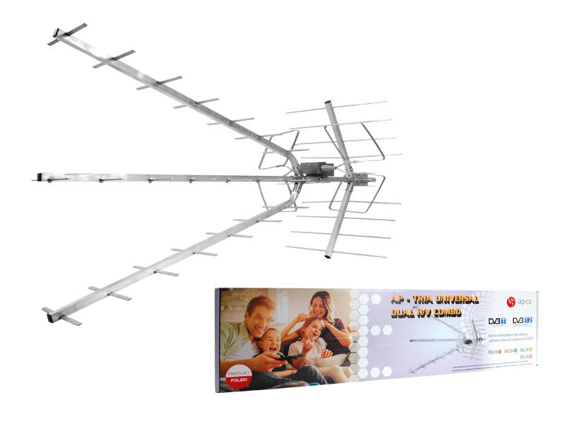 Aktywna antena kierunkowa telewizyjna AP-TRIA Universal Dual H/V Combo. Zewnętrzna antena przeznaczona jest zarówno do odbioru sygnału cyfrowego DVB-T nadawanego z nadajników naziemnych jak i sygnału analogowego.