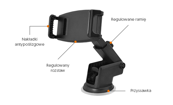 Uchwyt został zaprojektowany tak, aby pasował do większości smartfonów dostępnych na rynku. Wszystko to dzięki zastosowaniu ruchomych łopatek trzymających urządzenie w uchwycie. Element trzymający, zamocowany został na obrotowej główce, co umożliwia swobodny obrót urządzenia, znajdującego się w uchwycie, o 360 stopni. Przyssawka wykonana z silikonu gwarantuje pewne trzymanie na szybie pojazdu. Kolejna zaletą uchwytu jest możliwość regulacji długości uchwytu, co doskonale sprawdza się, szczególnie w większych pojazdach typu BUS czy TIR.
