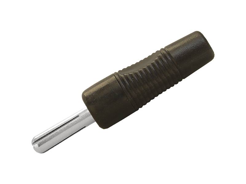 Solidnie wykonany, metalowy wtyk banan z plastikową obwódką w kolorze czarnym.